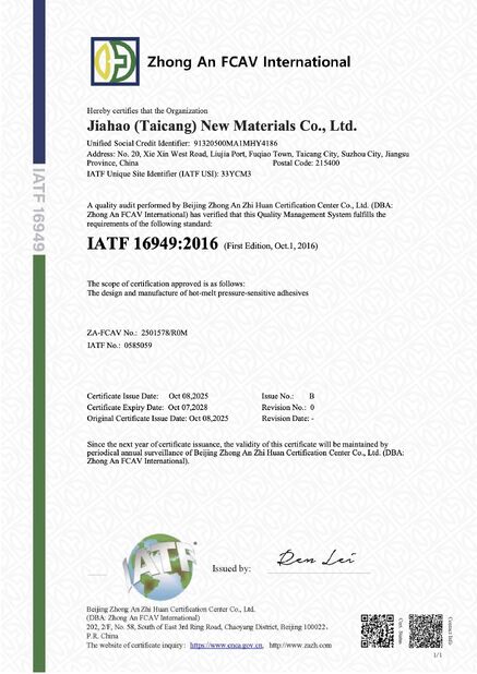Tiêu chuẩn:IATF 16949:2016 Con số:0585059 Ngày phát hành:2025-10-08 Ngày hết hạn:2028-10-07